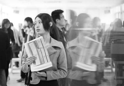 3月20日,一名求职者在招聘会上寻找适合自己的工作岗位。