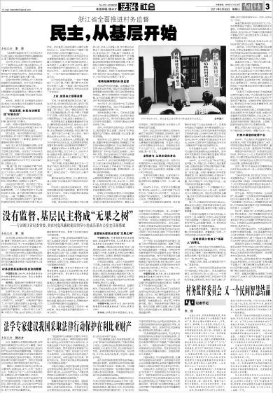 浙江省的一位领导告诉我,他认为这道难题最好的解决办法有两个,一是加强监督,二是把村干部手中直接产生经济效益的权力砍掉。目前,浙江的做法属于第一种,方法就是设立村务监督委员会。