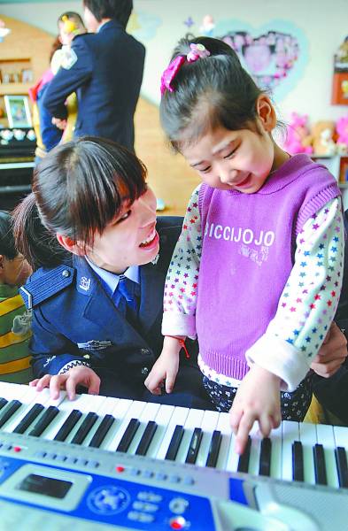 3月28日,女警姜燕和妞妞一起弹琴。性格内向的妞妞在姜燕的开导和鼓励下有了更多的笑容。当日,青岛麦岛派出所部分民警来到青岛儿童福利院开展“月末回访”活动,探望警方救助和长期帮扶的部分孤残儿童,送去孩子们喜欢的玩具和学习用品,并与他们一起谈心、做游戏。2009年以来,民警每月末都会坚持定期回访,不仅帮忙协调解决生活中的困难,更从心理上关心孩子们的健康成长,成为孩子们信得过、离不开的“编外亲人”。新华社记者 李紫恒摄
