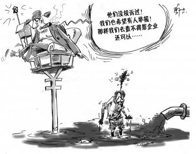 近期,浙江省台州市路桥区139名村民被查出血铅严重超标,元凶是一家被列为重点监控企业的蓄电池企业。路桥环保分局局长说,该企业成立8年来,没有群众举报过,该局也没检查出问题。(《京华时报》3月29日)漫画:徐简
