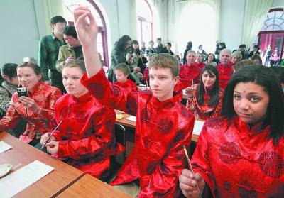 4月8日,在开笔礼中,外籍学子们学习毛笔的使用方法。