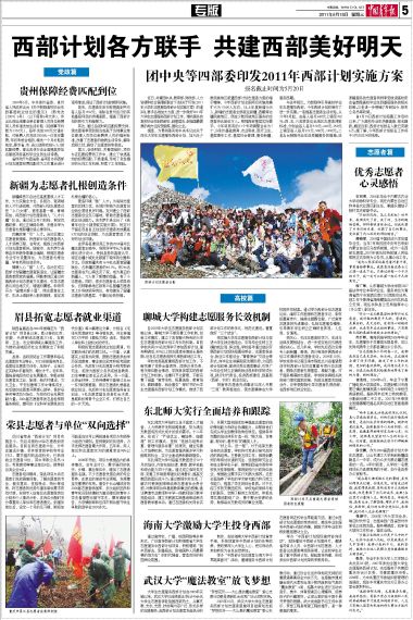 近日,共青团中央、教育部、财政部、人力资源和社会保障部联合下发《关于印发〈2011年大学生志愿服务西部计划实施方案〉的通知》,要求各地加大力度,进一步做好2011年大学生志愿服务西部计划工作,推动更多的高校毕业生到西部去、到基层去、到祖国最需要的地方去经受锻炼、建功立业。