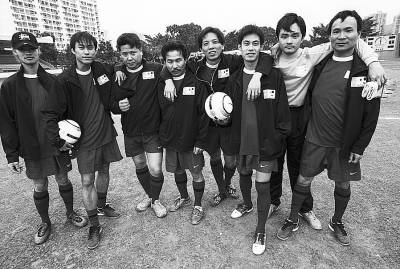 14个男人,穿着统一的队服,在一块水泥场地上来回奔跑、接球、射门……5月3日晚,在香港深水埗街心公园的一块小型球场里,一支足球队正在认真地训练。4盏照明灯的强光照射下,可以清晰地看见球员们脸上的汗水。