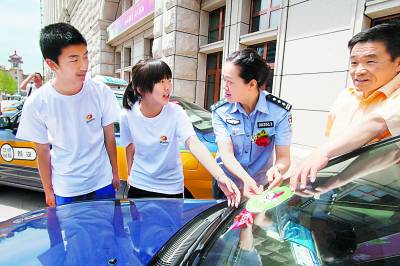 6月3日,一位女民警和来自北京广渠门中学宏志班的学生代表一起为出租车贴上“爱心送考绿色通行证”。当日,全国爱心送考活动在北京启动,全国100个城市贴有“爱心送考绿色通行证”的车辆可以优先通行。