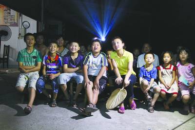 7月28日,重庆市荣昌县仁义镇石梯子村,谢开翠组织留守儿童看露天电影。