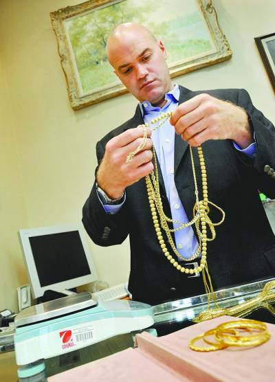 8月9日,美国华盛顿,一名珠宝店的工作人员拿出黄金首饰称重。