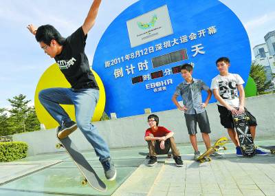 8月11日,几名学生在广东省深圳市福田区市民广场上训练滑板,他们身后的倒计时牌显示,距第26届世界大学生夏季运动会开幕还有一天。