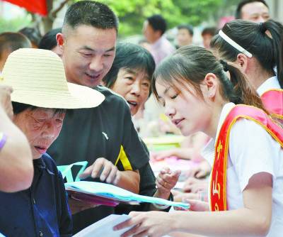 8月9日,几名大学生在湖北省竹山县宝丰镇向群众宣传地质灾害防治知识。针对夏秋季节降雨频繁、极易诱发地质灾害的特点,该县50多名大学生利用暑期向群众义务宣传地质灾害防治知识,增强群众安全防范意识。