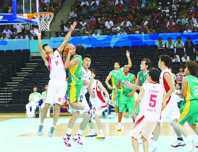 8月15日,在深圳大运会中国男子篮球队与巴西队的比赛中,中国队队员在奋力防守。本报记者 杨姣摄