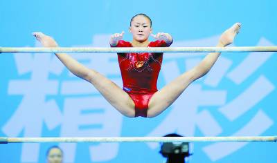 8月16日,中国选手官文荔在大运会体操女子高低杠决赛中获得第五名。本报记者 刘占坤摄