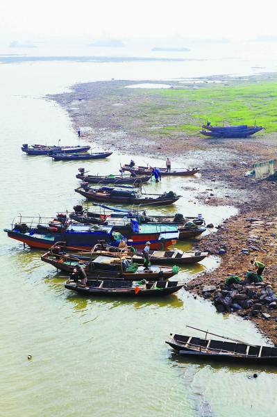 9月4日,鄱阳湖九江市庐山区蛤蟆石水域,渔船停泊在低水位下的闸口。