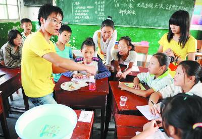 8月26日,在湖北省潜江市高石碑镇二中,大学生志愿者为留守儿童上实验课。