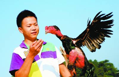 8月30日,广西融水苗族自治县融水镇,大学生杜慜君给斗鸡拍照,准备挂上网店。