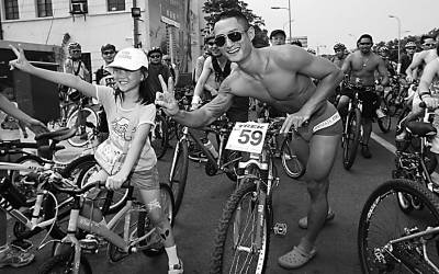 9月17日,上海,一群帅哥美女,只穿沙滩裤、比基尼参加正在举行的“裸骑上海”活动,这项为迎接“世界无车日”而举行的活动在丰阁路上举行,吸引了众多的白领车友参与。他们希望通过这一活动,让更多的人参与到自行车这种低碳环保的运动中来。