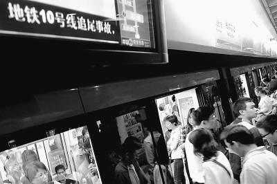 9月27日,上海地铁2号线的显示屏上不断显示列车追尾事故信息。