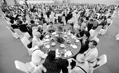 10月9日,江苏省南京市国际博览中心举行盛大的“千叟宴”,来自全国各地千余名65-107岁健康老人欢聚一堂,共品寿宴、共话健康。秦淮/CFP供图