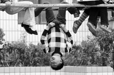2007年3月22日,河南省郑州市某小学校园内,一名小学生悠闲地倒挂在双杠上,全然不知游戏的危险性。