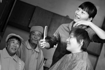 10月25日,美发师彭大荣作为社区志愿者正在给清洁工王琴(右前)理发。当日,安徽合肥市瑶海区城管局清洁一队的城市清洁工在自己的班组里,免费享受社区美发师的美发、理发服务。