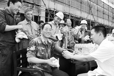今年7月27日,浙江省上虞市百官街道卫生院医务人员在为农民工进行免费体检。有网友评论,应定期为农民工进行体检,避免走过场。