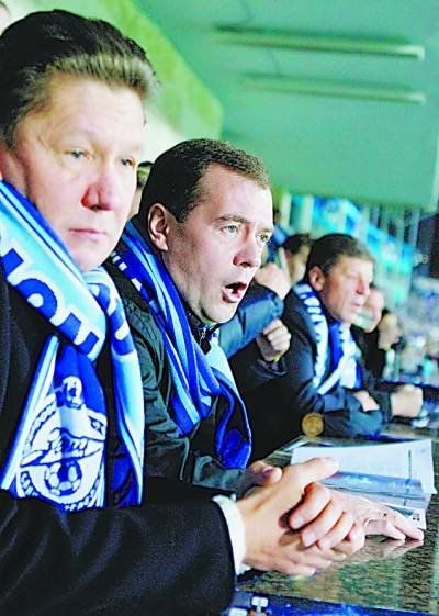 当地时间11月1日,圣彼得堡,11/12欧冠小组赛,俄罗斯总统梅德韦杰夫(左二)现场观战圣彼得堡泽尼特队的比赛。最终主队以1∶0战胜对手。