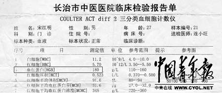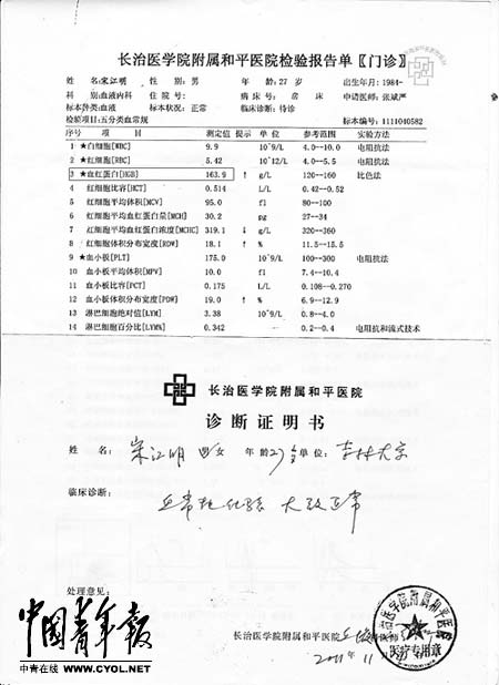 此外,宋江明还拿着化验单到门诊看了医生,以排除患血液病的可能性。长治市中医医院的诊断证明书显示临床诊断结果为“感冒(WBC偏高)”(WBC是指白细胞——记者注),长治医学院附属和平医院的诊断证明书则显示临床诊断结果为“血常规化验大致正常”。