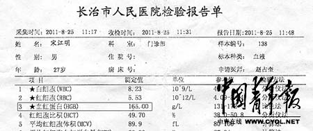 于是,宋江明于8月19日、8月25日前往长治市中医医院、长治市人民医院验血;后来,又在9月4日和11月4日两次去此前曾参加体检和复查的长治医学院附属和平医院进行化验。这4次验血的结果是:宋江明的血红蛋白测量值分别是180g/L、165g/L、167g/L、163.9g/L。