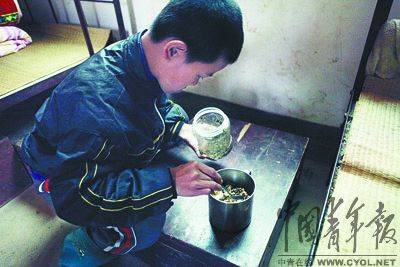 第二天早上5点30分,王艳华起床装上一小袋米,放进书包里,书包的拉链已经坏了,她用绳子将书包捆上,背在肩上,打起雨伞,走上了上学的路。8点到校,先去食堂领取蒸熟的米饭,这是昨晚提前放好在蒸屉上的,一个蒸屉上摆着几十个不锈钢杯子,里面都只有白米饭。回到寝室,王艳华从自己的箱子里拿出咸菜,她说,每天都是咸菜就米饭,咸菜吃完了,就买些辣酱。男生寝室,王树林正坐在自己的木箱上端着不锈钢杯吃饭,今天带的咸菜里有豆腐干,他吃得津津有味。寝室里放着3张上下床,住了9个孩子。