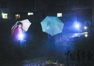 王艳华和同学一起回家,路上天渐渐黑了,他们打开手电,在雨中行走。