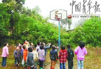 雄岗小学教学点,孩子们在一片杂草丛生的空地上玩篮球。老师说,篮球架是多年前捐建的,没有打气的工具,所以球一直瘪着。