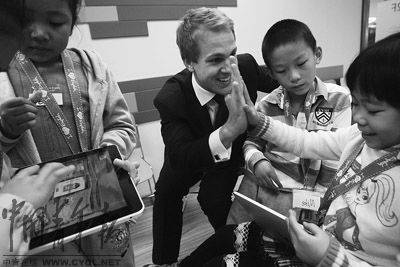 11月15日,北京英孚青少儿学校,来自瑞典的教育学者安德斯正在教小朋友如何使用iPad进行远程的英语交互学习。有专家指出,这些东西只是辅助性的教学工具,不可能完全取代家长和老师对孩子的面授。