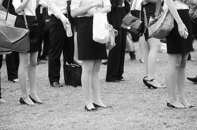11月19日,暨南大学。广东省2012届高校毕业生系列供需见面活动现场,女大学生为增加自己找工作的筹码使出了女性的法宝:丝袜、短裙、高跟鞋。笑笑/CFP