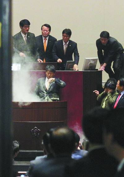 为促使当天的投票表决成功,大国家党率先占据了国会会场,为此执政党和在野党爆发了激烈争执,并发生了人员肢体冲突。一名在野党议员甚至向会场投掷了催泪弹,引发了会场混乱。