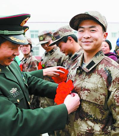 12月2日,在河南省长葛市新兵入伍欢送会上,当地人武干部为释小广戴上光荣花。(图1)