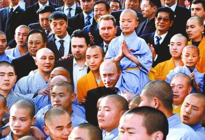 释小广原名叫孙光华,是河南省长葛市和尚桥镇于井村人,4岁时被家人送到少林寺学习武功。2006年3月22日,时任俄罗斯总统的普京造访少林寺,释小广表演的“少林童子功”,引起了普京的极大兴趣,待武僧们表演完毕后,他走下台阶,欣喜地抱起了释小广,将他扛在肩上和大家一起拍照留念(图2)。2007年3月27日,普京又专门邀请释小广等3名少林武僧到克里姆林宫做客。