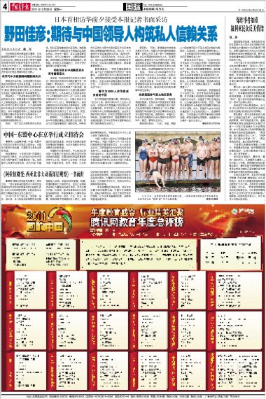 野田在采访中称,中国发展对包括日本在内的国际社会而言是机遇,日本与中国不仅对双方而且也对地区及世界的和平、稳定、繁荣负有重大责任,从大局观点出发深化“战略互惠关系”具有重要意义。