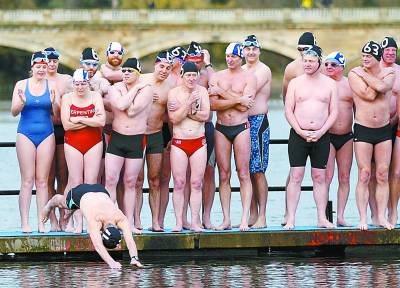 12月25日,在英国首都伦敦的海德公园,一家游泳俱乐部的会员参加每年在圣诞节举行的“彼得·潘”杯冬泳障碍赛。