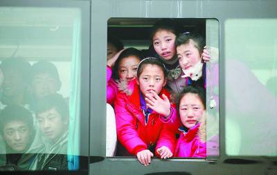 12月30日,玉树的学生们在大巴车窗口与老师依依惜别。当日,在天津耀华滨海学校异地复课的500余名玉树灾区学生正式结束了在天津的学习生活,踏上了返乡的旅途。