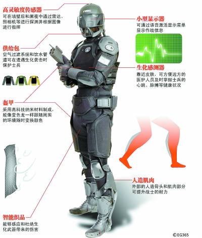 南非的“非洲勇士”系统,特别强调人的生物学特性。特制的眼镜框架,能够发出与晨曦光谱一样的白色强光,令昏昏欲睡的士兵觉醒而不影响视力。新设计的靴子,经过特殊工艺加工,能够分散脚掌的压力,使行进在沼泽地的士兵不会感到吃力。