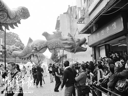 在大三巴牌坊参加了“庆祝澳门回归12周年”的盛大纪念仪式后,我们观看了极具澳门特色的大巡游。走在巡游队伍前列的人们,手举着各种颜色的“澳门龙”,一会儿将龙头伸进店铺张望,一会儿亲吻路边的孩子。在窄窄的马路两边,挤满了举着纪念小旗的市民,随着手风琴伴奏的音乐,一群群葡萄牙血统的男女青年在马路中央跳起欢快的土风舞。