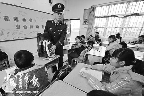 1月6日下午,广西南宁市东小学五年级二班学生在消防官兵的指导下,学习如何正确燃放烟花爆竹和使用取暖器等消防知识。寒假临近,南宁市消防支队联合市教育部门联合开展“假前学消防,平安过大年”活动,把消防知识课送进中小学校园,通过教育一个孩子,带动一个家庭共同做好春节期间的火灾防范工作。 本报记者 谢洋摄