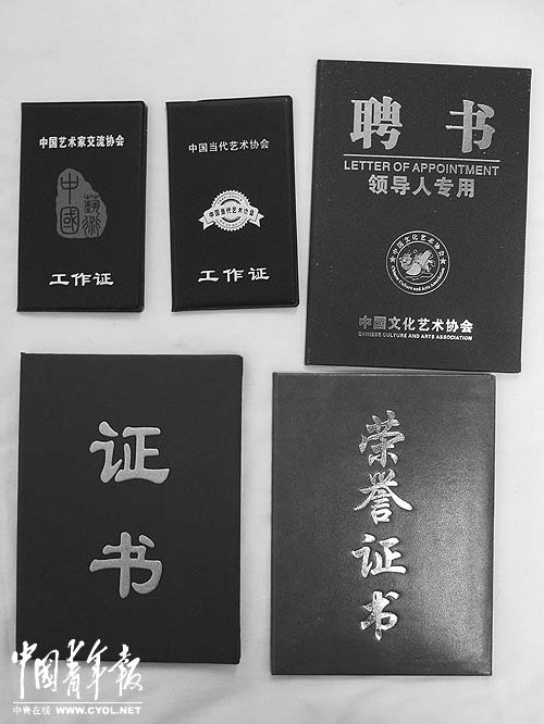 除用评奖来吸引被害人汇款外,有的不法分子采取的诈骗手法是“戴高帽子”,即许诺被害人在汇款后,将担任某中字头机构的常务理事、荣誉会长等“要职”,甚至还会给被害人邮寄相关头衔的证书——此前,张振中便收到过名为“中国人才发展中心”、“中国艺术家交流协会”、“北京华艺苑国际文化艺术交流中心”等机构发来的邀请函,承诺其在缴纳一定费用后,可以担任相关职务。
