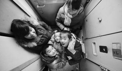 1月17日早晨,在车厢连接处,白靖(右一)和同行的小伙伴依偎在家长身边玩耍。