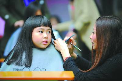 2月12日,6岁半的叶倩如小朋友(左)在妈妈的带领下参加义剪活动,为小碧心奉献爱心。当日,“爱从头开始 十万火急救碧心”义剪筹款活动在广州举行,为11岁的广州白血病女孩刘碧心捐款。来自广州市区10多家知名美发机构的150多位发型师与市民共同参与,共筹集善款381983.56元。