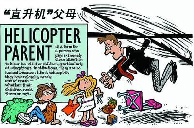 准确地说,在美国,大家更愿意将这种父母戏称为“直升机父母”。他们在学校、操场和课外活动地点转悠,像直升机一样盘旋在孩子头顶,与孩子紧紧绑在一起。