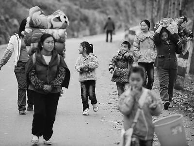 2月14日,在广西凤山县金牙瑶族乡,家长背着棉被送孩子上学。