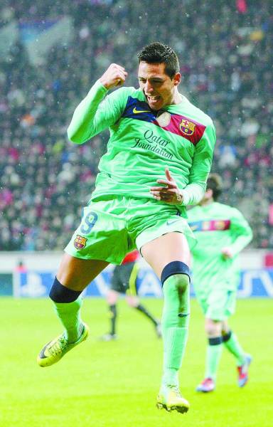 2月15日,在欧冠1/8决赛首回合较量中,巴塞罗那队客场以3∶1击败勒沃库森。图为打进两球的巴塞罗那球员桑切斯庆祝进球。CFP供图