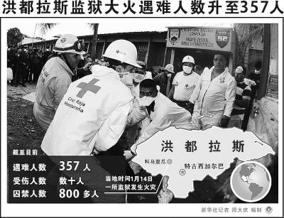洪都拉斯司法部办公室官员费雷拉15日说,火灾已造成359人死亡,另外还有56名犯人或嫌疑人下落不明。随着遗体辨认工作逐步展开,遇难者人数很可能超过400人。
