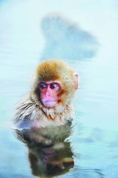观察这些小猴子,我有两个有趣的发现。其一,常常看到有些面无表情、做深思状的猴子,一动不动地站在温泉池中,那神态,像极了地铁里的东京人;其二,可爱的小猴子在温泉池中,居然是两条腿走路的,而回到陆地上,它们就又变成四脚着地,大概是因为水中浮力大的原因吧。