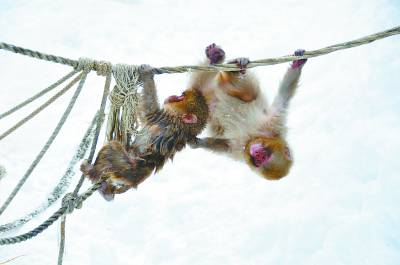 就像我们人类一样,在这么热的汤池中,猴子也无法待得太久,所以它们不时跳出水池,湿漉漉地跑到雪地上去觅食,甚至在秋千上打打闹闹,十分有趣。因为频繁往来于雪地和汤池中,猴子们有的头上沾满了雪,有的身上甚至结了小冰珠,煞是可爱。有几只幼猴,无论是在水中还是雪地里,看起来简直就像毛茸茸的球一般,不知道谋杀了多少人的快门。