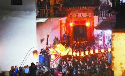 最早的一场灯会年初三就举行了,地点在浙源乡的察关村。往年这里都是正月十五才舞龙,但是村里的少壮青年多在外打工,不到十五就要纷纷返回打工地了,因此,他们把舞龙的时间提前到了大年初三。接近察关村祠堂的时候,路边聚集了很多人,定睛一看,发现龙灯正蜿蜒在远处的田埂路上。赶紧下车观望,只见前面是一些星星点点的光,后面是一条长长的龙,后来才知道,前面那些是各种形状的花灯,有莲花灯、鲤鱼灯、十二生肖灯等。